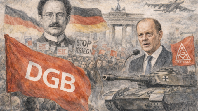 Während die Gewerkschaftsführung von Frieden spricht, wird die Aufrüstung weiter vorangetrieben. Der deutsche Imperialismus tritt nicht im Verborgenen auf, sondern steht offen im Zentrum der Militarisierung. Wer den Krieg bekämpfen will, muss den Hauptfeind im eigenen Land benennen und den Kampf gegen ihn aufnehmen. | Photo: © DerRevolutionär (KI generiert)